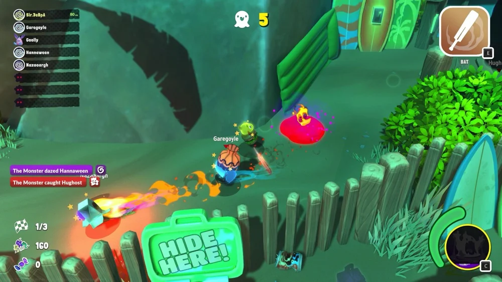 A variedade dos mapas surpreende, cada um com armadilhas específicas — de recifes com tubarões a mansões assombradas com portais —, mantendo as partidas sempre frescas. Já os efeitos sonoros e trilha ajudam a intensificar o clima de perseguição e adrenalina, sem perder o tom descontraído.