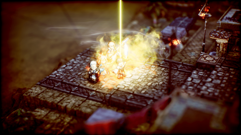 Visualmente, Triangle Strategy é um espetáculo. A Square Enix consolidou o estilo HD-2D, já visto em Octopath Traveler, e aqui ele alcança um refinamento impressionante. Os cenários parecem maquetes em miniatura, com iluminação dinâmica e detalhes minuciosos que dão vida ao mundo de Norzelia.
