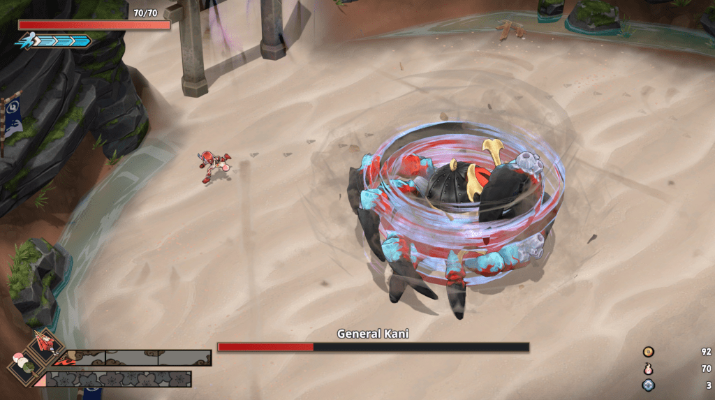 A jogabilidade de Yasha segue a fórmula conhecida dos hack and slash 2D: combos rápidos, esquivas no tempo certo, e ataques especiais que podem ser desbloqueados ao longo da jornada. O combate é responsivo e satisfatório no início, mas ao longo das 8 a 10 horas de campanha, começa a mostrar sinais de desgaste.